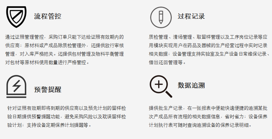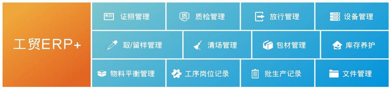 工貿(mào)ERP醫(yī)藥行業(yè)版&醫(yī)療器械版是在工貿(mào)ERP標(biāo)準(zhǔn)流程(供應(yīng)鏈管理+生產(chǎn)管理+財務(wù)管理)基礎(chǔ)上,結(jié)合醫(yī)藥及醫(yī)療器械行業(yè)中特有的生產(chǎn)質(zhì)量管理需求,增加了證照管理、質(zhì)檢管理、放? 行審核管理、清場管理、批生產(chǎn)記錄、設(shè)備管理、文件管理等特色模塊,以滿足客戶在醫(yī)藥行業(yè)及醫(yī)療器械行業(yè)的應(yīng)用要求。