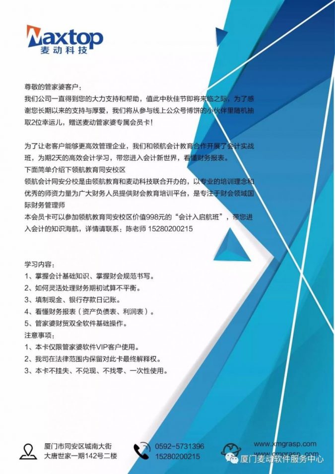 尊敬的管家婆客戶: 我們公司一直得到您的大力支持和幫助,值此中秋佳節(jié)即將來(lái)臨之際,為了感謝大家長(zhǎng)期以來(lái)的支持與…